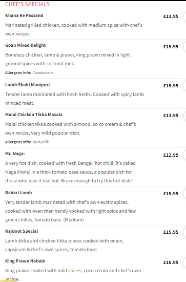 Welcome to The Rajdoot, a gem nestled in London at 104 Fleet Rd. This restaurant seamlessly blends traditional Indian flavors with a modern touch, making every dish a delightful experience. Their menu is a treasure trove of culinary delights, featuring Traditional Favourites like the spicy Vindaloo and the aromatic Korma. Each curry, ranging from medium to very hot, is priced around £10.95.